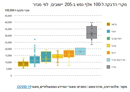 תמונה שונה במקצת עולה בנוגע לנדבקים מאומתים – אחוז הנדבקים המצטבר הנמוך ביותר נמצא במגזר הבדואי (כ-8.4%) והגבוה ביותר במגזר החרדי (31.0%), בעוד הממוצע הארצי עמד על 13.7%. חריג במיוחד הוא המגזר החרדי, עם רמות גבוהות של נדבקים מאומתים יחסית לשאר היישובים. רכסים וביתר עילית הובילו עם אחוז נדבקים מאומתים של כ-40% וכ-38%, בהתאמה. לאחר פיקוח על עוני, צפיפות אוכלוסייה, אחוז התושבים בני 65 ומעלה ועוד כמה מאפיינים, אחוז הנדבקים נשאר פי 2.4 גבוה יותר ביישובים חרדיים לעומת יישובים יהודים לא-חרדיים.